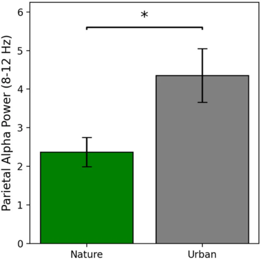 Nature vs. Urban Scenes: The study found that when people looked at images of nature, a specific type of brain wave activity, called parietal alpha power, was lower. This suggests that nature images are more attention-grabbing and hold our interest more than urban images.