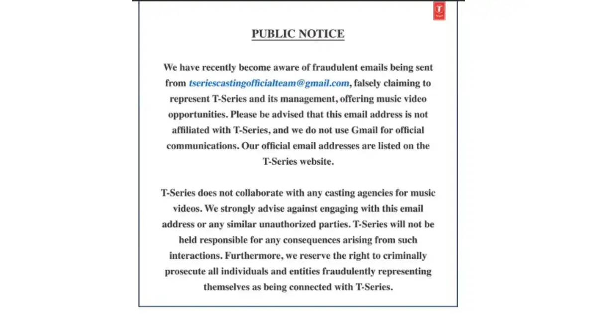 Read More: T-Series warns of fake emails offering fake music video jobs