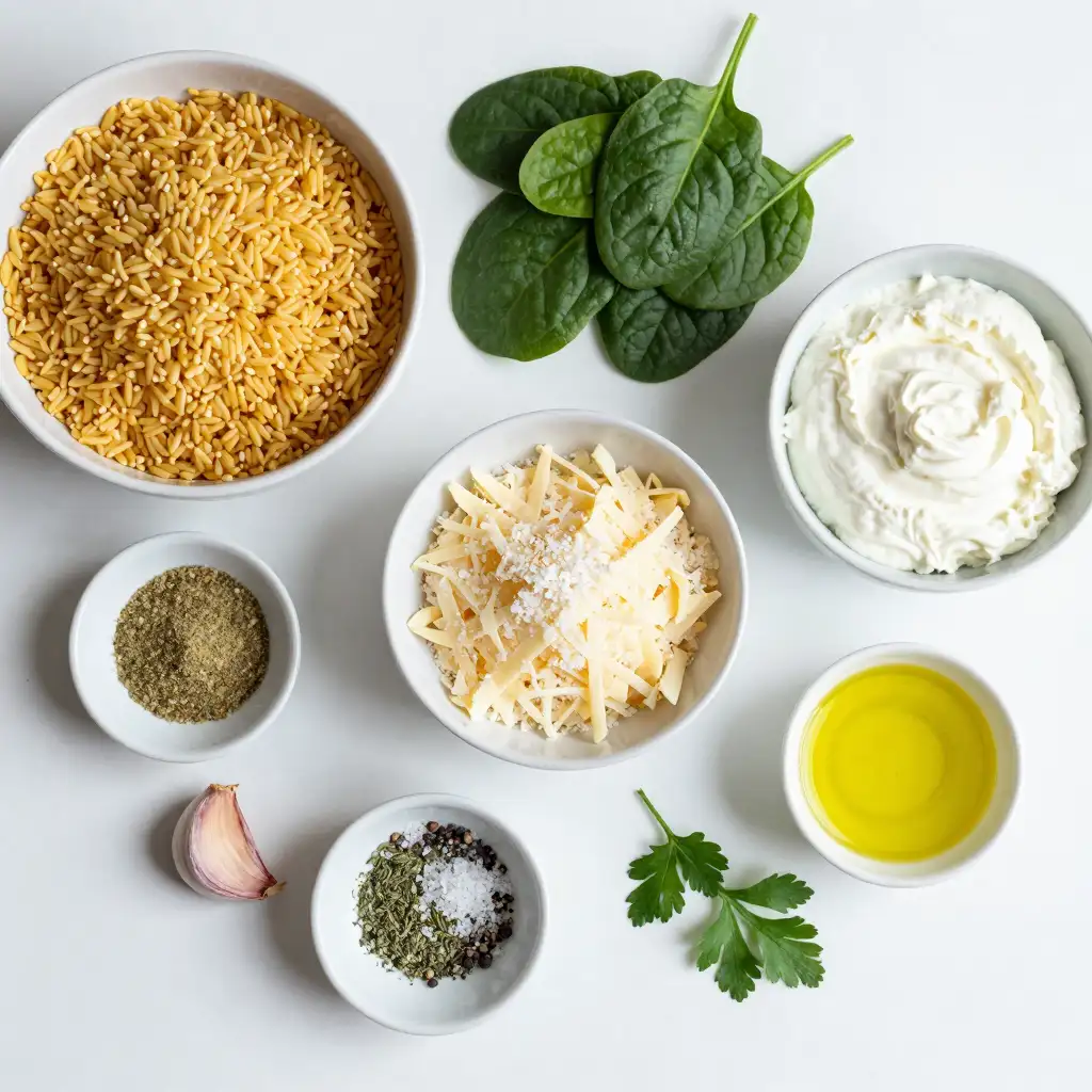 The production of the Three-Cheese Spinach Orzo Bake functions as a ritualized reorganization of grain and fermented dairy. Sources across a fifteen-year span confirm a standardized architecture: small-bead pasta (orzo) serves as a substrate for fresh spinach and a trifecta of cheeses. Structural failure occurs primarily through moisture mismanagement—specifically residual water in the leafy greens or incorrect liquid ratios in slow-cooker variants.